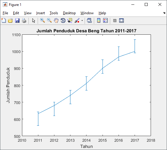 Diketahui jumlah penduduk Desa Beng dari tahun [2011:2017] adalah sebagai berikut 632, 680, 740, 811, 900, 967, 1000. Buatlah grafik dilengkapi error bar dari bilangan acak dengan standar deviasi 80 yang dapat merepresentasikan data tersebut?
